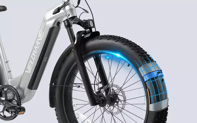 26"*4.0" Fat Tire, anti-skidding, wear-resistant, adapt to snow, sand, and various terrains. The fat tire enables smooth riding on rugged landscapes means you can get more cycling experiences.